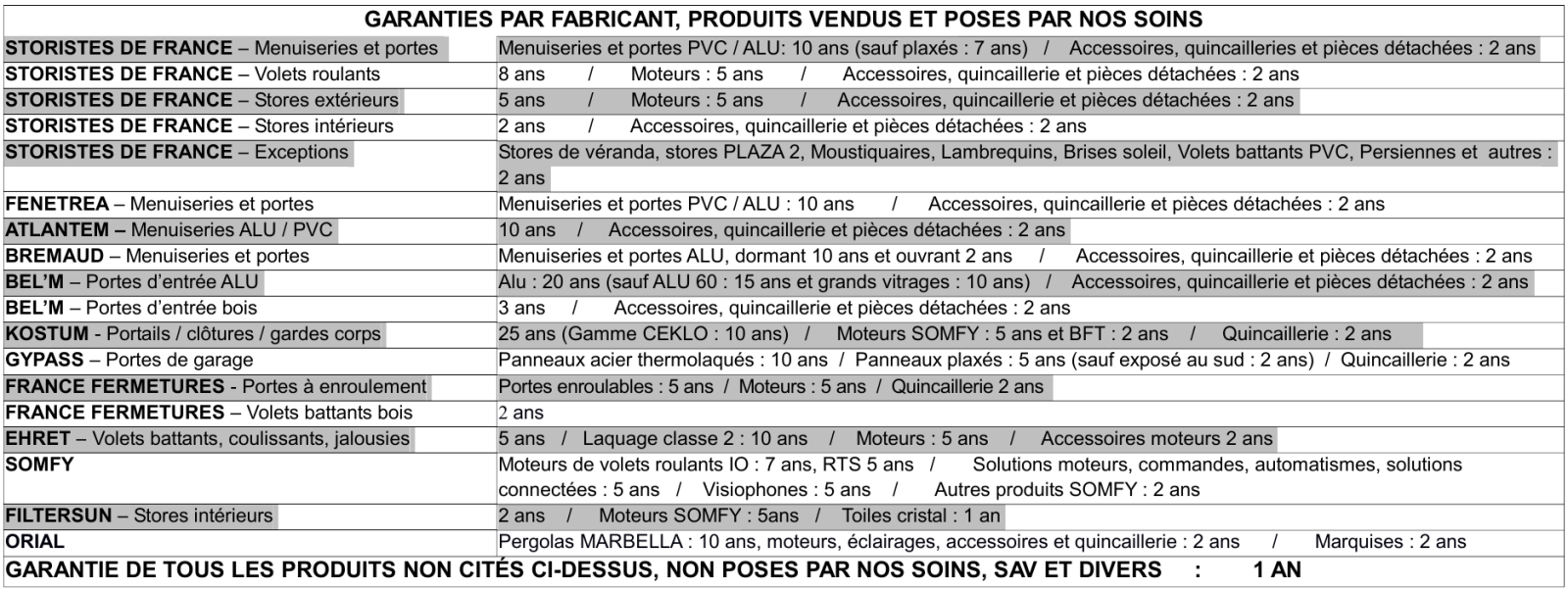 Seuls nos produits portant la marque Storistes de France sont couverts par la garantie nationale, pièces, main-d’œuvre et déplacement Storistes de France. Cette garantie démarre dès la signature du bon de réception des travaux. Pour les autres produits, la garantie s’applique uniquement aux produits vendus et installés par TOURY FERMETURES et est limitée au remplacement des pièces selon les durées précisées ci-dessous. Nos prestations sont couvertes par une garantie décennale obligatoire et par une assurance responsabilité civile (identifiés au bas de nos devis et factures).